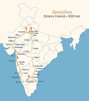 The program started on 22 March in Mumbai and passed through various Metro, tier II and III cities. After covering a distance of over 4598 kilometers across 12 cities from 11 states and connecting more than 5000 people, Develothon 2010 finally ended its journey back in Mumbai on 30 April.[2]