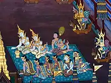 ![]() Mandodari (Left) and Dhanyamalini (right) with attendant Concubine in the funeral of Ravana., a scene from the Ramakien in Wat Phra Kaew, Bangkok. | |