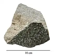 Diabase ( /ˈdaɪ.əbeɪs/) or dolerite or microgabbro[1] is a mafic, holocrystalline, subvolcanic rock equivalent to volcanic basalt or plutonic gabbro. Diabase dikes and sills are typically shallow intrusive bodies and often exhibit fine grained to aphanitic chilled margins which may contain tachylite (dark mafic glass). Diabase is the preferred name in North America, while dolerite is the preferred name in the rest of English-speaking world, where sometimes the name diabase is applied to altered dolerites and basalts. Some geologists prefer the name microgabbro to avoid this confusion.