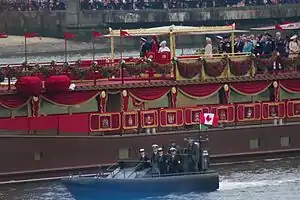 Many events were staged in London during the bank holiday weekend.[153] The River Thames Diamond Jubilee Pageant was held on 3 June; a maritime parade of 1,000 boats from around the Commonwealth—the largest flotilla seen on the river in 350 years—together with other celebrations along the river banks.[155][156][157] Heavy rain started during the event and the commemorative airforce flyover at the end was cancelled due to very low cloud base and bad visibility at ground level. Along with almost all members of the Royal Family, various governors-general from the Commonwealth realms other than the UK were in attendance.[107][130] The Diamond Jubilee Concert, with a preceding afternoon picnic in the palace gardens for the 10,000 concert ticket holders,[158][159][160] was held the following day, in front of Buckingham Palace, and featured acts representing each decade of the Queen's 60-year reign.