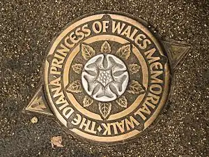 The walk passes between Kensington Gardens, Hyde Park, Green Park and St. James's Park[3] in a figure-eight pattern, passing five sites that are associated with Princess Diana's life: Kensington Palace, Spencer House, Buckingham Palace, St. James's Palace, and Clarence House. It is marked with ninety individual plaques, each of which has a heraldic rose etched in the centre made of aluminium. Prime Minister Gordon Brown, who was the Chairman of the Diana, Princess of Wales, Memorial Committee was quoted as saying it is "one of the most magnificent urban parkland walks in the world." The Diana, Princess of Wales Memorial Walk is in London, and celebrates the life of the Princess of Wales who died in a car accident on 31 August 1997 in Paris.