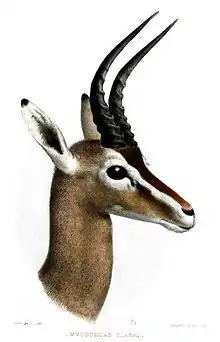 The dibatag was first described in 1891 by British zoologist Oldfield Thomas, who he gave it the scientific name Ammodorcas clarkei. It is the sole member of the genus Ammodorcas, and is placed in the family Bovidae. Some authors such as Rod East of the IUCN SSC Antelope specialist group have classified it under a separate tribe Ammodorcadini.[3] When Thomas first studied specimens from Somalia in 1891, he observed that the animal seemed to combine the horns of a reedbuck with the characteristic features of a gazelle (muzzle, facial markings, and anteorbital glands). At first, he considered it to be a reedbuck, though it appeared unnatural that a reedbuck should occur in the dry sandy plateau of Somalia. Thomas originally considered it a relative of the genus Redunca due to similarities in the morphology of horns, and placed it under the genus Cervicapra. However, after considering further specimens, he placed it under the separate genus Ammodorcas.[2] No subspecies have been identified.[3][4]
