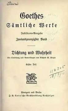 Aus meinem Leben: Dichtung und Wahrheit (From my Life: Poetry and Truth; 1811–1833) is an autobiography by Johann Wolfgang von Goethe that comprises the time from the poet's childhood to the days in 1775, when he was about to leave for Weimar.