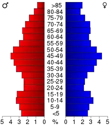 In the county, the population was spread out, with 21.90% under the age of 18, 6.60% from 18 to 24, 23.90% from 25 to 44, 26.90% from 45 to 64, and 20.60% who were 65 years of age or older. The median age was 43 years. For every 100 females, there were 95.00 males. For every 100 females age 18 and over, there were 92.30 males.