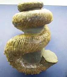 Didymoceras nebrascense was an extinct species of heteromorph ammonite from the upper Campanian age (around 83 to 70 million years ago). It was sexually dimorphic, with two adult sizes averaging at 270 mm (11 in) and 180 mm (7.1 in) high for females and males respectively. It exhibited three distinct growth stages. The first growth stage was composed of one or two straight sharply bending sections and a gently curved third. The second growth stage is composed of around three and a half loosely coiling whorls. The last (adult) growth stage is composed of a U-shaped bend facing upwards.