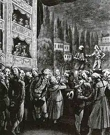 The inspector of the Nationalsingspiel was Gottlieb Stephanie.[2] When the 25-year-old Mozart arrived in Vienna in 1781, seeking professional opportunity, one of the first tasks to which he addressed himself was to become acquainted with Stephanie and lobby him for an opera commission. To this end, he brought a copy of his earlier unfinished opera Zaide and showed it to Stephanie, who was duly impressed. Mozart also made a strong impression on the manager of the theater, Count Franz Xaver Orsini-Rosenberg, when in the home of Mozart's friend and patroness Maria Wilhelmine Thun the Count heard him play excerpts from his opera Idomeneo, premiered with great success the previous year in Munich.[2] With this backing, it was agreed that Stephanie would find appropriate material and prepare a libretto for Mozart. Stephanie complied by preparing an altered version of an earlier work Belmont und Constanze, oder Die Entführung aus dem Serail without attributing or seeking permission from its original author Christoph Friedrich Bretzner. Bretzner later complained loudly and publicly about the theft.[3]