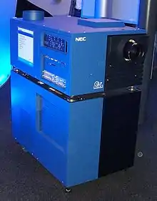 On February 2, 2000, Philippe Binant, technical manager of Digital Cinema Project at Gaumont in France, realized the first digital cinema projection in Europe[5] with the DLP CINEMA technology developed by Texas Instruments. DLP is the current market-share leader in professional digital movie projection,[6] largely because of its high contrast ratio and available resolution as compared to other digital front-projection technologies. As of December 2008, there are over 6,000 DLP-based Digital Cinema Systems installed worldwide.[7]
