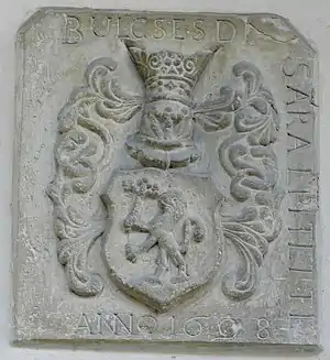 Papa had three children, of whom the only son, Diicul II, served as Spatharios under Prince Brâncoveanu.[78] From 1679, he had also been awarded Transylvanian citizenship and was granted a coat of arms by Michael I Apafi.[79] His estate was sold off: in 1691, Brâncoveanu purchased from Diicul II the village of Gioroc, which he later donated to Horezu Monastery;[80] in 1697, another one of Papa's estates, at Constantinești, was purchased by the local peasants.[81] Having bought himself a new demesne at Bălcești,[82] Diicul II sued his cousin Sára and his nephew Ádám Székely for their share of the Buicescul estate.[83] Diicul II died childless some time after 1705;[84] his main possessions went to Vintilă Bucșanu, and to Bucșanu's daughters.[85] By then, Papa's widow Dumitrana had also sold her land in Bârzoteni to the Starets of Horezu.[86]