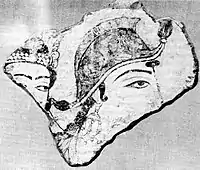 The town proper was about 390 x 390 m large. Dilbarjin had a city wall built under the Kushan rule. In the middle of the town there was a round citadel, built at about the same time. In the North-East corner of the town was excavated a temple complex. Here were found many wall paintings, some in a purely Hellenistic style. Originally the temple was perhaps dedicated to the Dioscuri, of which a mural in Hellenistic style has been recovered.[1] A long inscription in the Kushan language was also discovered, dated to the early great Kushans, around the period of Kanishka I, on paleographic grounds, as it seems slightly younger than the inscription of Surkh Kotal.[2] Outside the city walls there were still substantial buildings. Finds include inscriptions in Bactrian, most of them too destroyed to provide any historical information. There were fragments of sculpture and many coins.