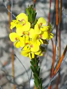 Dillwynia floribunda is a common bushy shrub found north of Ulladulla in moist areas of eastern Australia. It grows from 1 to 2 metres tall, the habitat is wet heathland, often on poor sandy soils. The specific epithet floribunda is from Latin, and it refers to the abundance of yellow and red flowers.[1] This attractive species has a common name of the Parrot Pea. Though casually remarked by bushwalkers as one of the egg & bacon group of wildflowers.