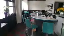 The restaurant featured a horseshoe-shaped kiosk-style counter displaying coffee, pastries, sandwiches, and a variety of 25 periodicals supplied by The City Reader, a Modern Newsstand on Southeast Division.[2][5] It was described as a "shinier" version of the coffee shop which had occupied the same space for thirty years prior, with grey and red linoleum flooring and teal pleather or vinyl seating.[5][8]