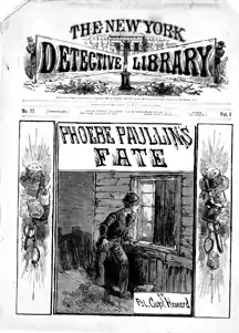 In 1860, the publishers Erastus and Irwin Beadle released a new series of cheap paperbacks, Beadle's Dime Novels.[1] Dime novel became a general term for similar paperbacks produced by various publishers in the early twentieth century. The first book in the Beadle series was Malaeska, the Indian Wife of the White Hunter, by Ann S. Stephens, dated June 9, 1860.[1] The novel was essentially a reprint of Stephens's earlier serial, which had appeared in the Ladies' Companion magazine in February, March and April 1839. It sold more than 65,000 copies in the first few months after its publication as a dime novel.[2] Dime novels varied in size, even in the first Beadle series, but were mostly about 6.5 by 4.25 inches (16.5 by 10.8 cm), with 100 pages. The first 28 were published without a cover illustration, in a salmon-colored paper wrapper. A woodblock print was added in issue 29, and the first 28 were reprinted with illustrated covers. The books were priced, of course, at ten cents.