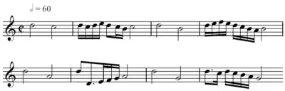 Diminution is a form of embellishment or melodic variation in which a long note or a series of long notes is divided into shorter, usually melodic, values, as in the similar practices of breaking or division in England, passaggio in Italy, double in France and glosas or diferencias in Spain.[1] Thoroughly documented in written sources of the 16th, 17th and early 18th centuries, with a remarkable flowering in Venice from about 1580–1620, diminution is an integral aspect of modern performance practice. Donington describes the consequences of failing to add "necessary figuration" as "disastrous".[2]