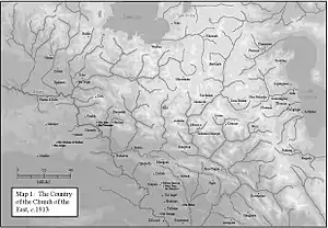 As with the Chaldean church, the population of the Qudshanis patriarchate (including the Urmi communities which temporarily converted to Russian Orthodoxy) seems to have risen appreciably in the decades before the First World War. A number of contemporary estimates were made, ranging from as low as 18,000 to as high as 190,000, with the majority of estimates falling somewhere between 70,000 and 150,000, and informed opinion favouring a figure of about 100,000. In 1923 Tfinkdji estimated its population in 1914 at about 95,000 (60,000 in Turkey and 30,000 in Persia). The evidence of two surveys of 1900 and 1914 suggests that the true figure may have been between 100,000 and 120,000. The provincial government of Van estimated that there were 97,040 East Syriacs in the sanjak of Hakkari in 1900, and the East Syriac priest Benjamin Kaldani estimated the East Syriac population of the Urmi district at 6,155 families (about 30,000 individuals) in 1914. The 1900 official statistics probably include several thousand Chaldeans, and Kaldani's figures include a number of Chaldean villages in the Salmas district. Allowing for the necessary deductions, the total population of the Qudshanis patriarchate on the eve of the First World War may have been between 100,000 and 120,000. If so, it was still slightly larger than the Chaldean church, but the gap was narrowing.[11]