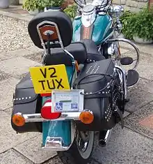 A UK "Blue Badge" Disabled Parking Permit in a custom permit holder for motorcycles, beside the license plate.