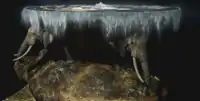 A tiny sun and moon orbit the Great A'Tuin, both about 1 mile (1.6 km) in diameter when described at the start of the series, but the description of their diameter is increased to at least 80 miles (130 km) later in the chronicles. The moon is slightly closer to the Disc than the sun, and is covered, on one half, with silvery glowing plants, which feed the lunar dragons.[3] The other half is burnt black by the sun. The moon rotates, and completes a full revolution in about a month; the full moon occurs when the luminescent side is completely visible from the Disc, the new moon when the dark side is shown. The sun's orbit is so complex that one of the elephants has to cock its leg to allow the sun to continue on its orbit.[4]