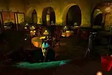In contrast to the first two more brightly-coloured Discworld games, Noir has been called "grittier, darker and more realistic" in style.[2] The game parodies hardboiled fiction and film noir.[6] Lewton is a classic private detective figure, with an appearance and jacket reminiscent of noir detectives.[7] PC Zone compared the character to Sam Spade and Philip Marlowe as played by Humphrey Bogart.[2] Carlotta, meanwhile, has been frequently called a femme fatale figure.[2][8] Discworld Noir's background music features heavy use of "discordant" strings and dissonance in order to match the mood of classic film noir, and has pieces in the style of jazz and blues. One song in the game serves as a counterpart to the song "As Time Goes By", used in 1942 film Casablanca.[1]