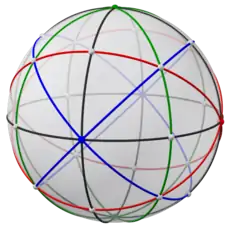 The edges of a spherical disdyakis dodecahedron belong to 9 great circles. Three of them form a spherical octahedron (gray in the images below). The remaining six form three square hosohedra (red, green and blue in the images below). They all correspond to mirror planes - the former in dihedral [2,2], and the latter in tetrahedral [3,3] symmetry.