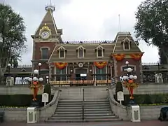 Before the opening of Disneyland, a station in the Main Street, U.S.A. section and a station in the Frontierland section were built for the DRR.[27][31] Main Street, U.S.A. Station, an example of Second Empire-style architecture, was built at the entrance to Disneyland using an original design that incorporated forced perspective elements on its upper levels to make it appear taller.[32][33] Frontierland Station was built based on the design of the depot building located on the Grizzly Flats Railroad, a full-size 3 ft (914 mm) narrow-gauge railroad owned by Disney animator Ward Kimball in his backyard.[22][34] Besides the depot building, the DRR's functioning water tower was also built at Frontierland Station.[34][35]
