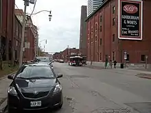 Trinity Street is the widest street in the district and often functions as a public square for events such as market days. The main thoroughfares within the district are Distillery Lane from Parliament Street running southeast to Trinity Street, Trinity Street from Mill Street at its north end to the motor vehicle parking area at its south end, and Tank House Lane from Trinity Street east to Cherry Street. The four borders of the Distillery District are Parliament Street to the west, Mill Street to the north, Cherry Street to the east, and the parking area to the south with the condominiums along Distillery Lane forming hard edges to pedestrians.