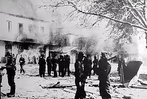 ![]() German troops in front of buildings set ablaze in Distomo, during the massacre. | |