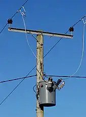 Pole-mounted transformers often include accessories such as surge arresters or protective fuse links. A self-protected transformer includes an internal fuse and surge arrester; other transformers have these components mounted separately outside the tank.[10] Pole-mounted transformers may have lugs allowing direct mounting to a pole, or may be mounted on crossarms bolted to the pole. Aerial transformers, larger than around 75 kVA, may be mounted on a platform supported by one or more poles.[11] A three-phase service may use three identical transformers, one per phase.