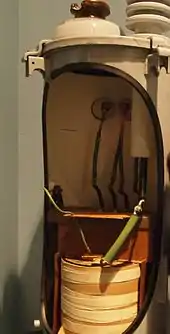 The high voltage primary windings are brought out to bushings on the top of the case.