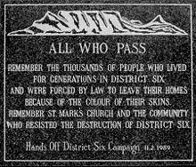 District Six (Afrikaans Distrik Ses) is a former inner-city residential area in Cape Town, South Africa. Over 60,000 of its inhabitants were forcibly removed during the 1970s by the apartheid regime.
