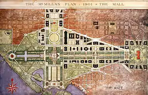 Although great strides had been made in the development of the city's municipal as well as federal parks, no comprehensive strategy had been followed. By 1900, competing visions for the further development of the city threatened to turn many of the capital's parks over to development. That year, the United States Senate established the Senate Park Commission (popularly known as the McMillan Commission after its chairman, U.S. Senator James McMillan). The McMillan Commission produced a report, known as the McMillan Plan, in 1901 which laid out a new, comprehensive vision for the development of parks in the District of Columbia.[10][11] The McMillan Plan proposed that Anacostia Park, East Potomac Park, and West Potomac Park, areas created by dredged material taken from the Potomac and Anacostia riverbeds between 1882 and 1920, be designated as parks (rather than commercial land). The areas were duly set aside as parkland.[12] Over the next few years, the President and Congress established several new agencies to supervise the approval, design, and construction of parks in the District of Columbia. The Commission of Fine Arts was established in 1910 to oversee and advise on the design of parks, and the National Capital Parks and Planning Commission was created in 1924 to oversee planning for the District.[13]