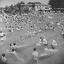 Federally and city-owned recreational facilities were strictly segregated by race from their beginning. As late as 1949, the D.C. Board of Recreation voted to stop offering swimming programs at privately owned pools if those pools were racially desegregated.[23] However, in the early 1950s, the first attempts to desegregate public facilities began. In June 1951, the first of the city's public playgrounds was desegregated.[24] After the United States Supreme Court's decision in Bolling v. Sharpe, 347 U.S. 497, in 1954 (which desegregated city public schools), public recreational programs, recreational facilities, and parks quickly desegregated (although isolated incidents of racial discrimination continued into the late 1950s).[25]