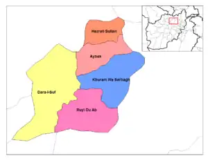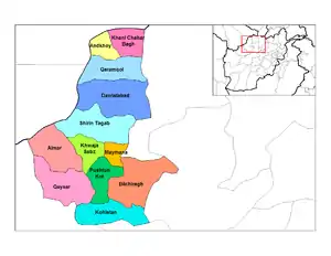 This is a list of districts of Afghanistan, known as wuleswali (Pashto: ولسوالۍ, wuləswāləi; Persian: شهرستان, shahrestān). These are secondary level administrative units, one level below the provinces. The Afghan government issued its first district map in 1973.[1][2] It recognized 325 districts, counting wuleswalis (districts), alaqadaries (sub-districts), and markaz-e-wulaiyat (provincial center districts).[2] In the ensuing years additional districts have been added through splits, and a few eliminated through mergers. In June 2005, the Afghan government issued a map of 398 districts.[3] It was widely adopted as by many information management systems, though usually with the addition of Sharak-e-Hayratan for a 399 district total. Here is a link to a clean rendering of the 399 district set as a spreadsheet from an official Afghan source.[4] It remains the de facto standard, as of late 2018, despite a string of government announcements of the creation of new districts.