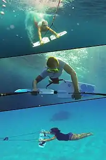 These are unpowered boards (usually rectangular) towed by a surface boat which function as diving planes. The diver holds onto the sled and may use a quick-release tether to reduce fatigue. Depth control while submerged is by adjusting the angle of attack. Sometimes known as manta-boards, after the manta ray. Towed sleds are useful for surveys and searches in good visibility in waters where there are not too many large obstacles. The route is largely controlled by the towing vessel, but the diver has a limited amount of control over vertical and lateral excursions.[18]
