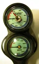 ![]() Diving regulator: First and second stages, low pressure inflator hose and submersible pressure gauge | |
