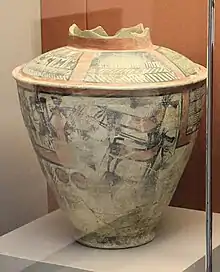 A type of pottery known as 'Scarlet Ware', a brightly coloured pottery with pictorial representations, was typical of sites along the Diyala River.[7] It developed around 2800 BC, and is related to the Jemdet Nasr ware in central Mesopotamia of the same period. The red colour was achieved predominantly by using haematite paint.