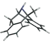 As an antidepressant, positive results were found in animal models of depression.[24] NMDA antagonists like dizocilpine have been shown in animal models to attenuate the hearing loss caused by aminoglycosides It is thought that aminoglycosides mimic endogenous polyamines at NMDA receptors and produce excitotoxic damage, leading to hair cell loss. Antagonizing NMDA receptors to reduce the excitotoxicity would prevent that hearing loss.[25][26] Dizocilpine was found to block the development of kindled seizures, although it does not have any effect on completed kindled seizures.[27] Oddly, it was discovered to decrease rabies virus production and is believed to be the first neurotransmitter antagonist to present with antiviral activity. Rat cortical neuron cells were infected with the rabies virus and those incubated with dizocilpine had virus produced reduced about 1000-fold. It is not known how MK-801 has this effect; the rabies virus suspension, without cells, was inoculated with dizocilpine and the drug failed to produce a virucidal effect, indicated that the mechanism of action is something other than direct discontinuation of virus reproduction. It was also tested against herpes simplex, vesicular stomatitis, poliovirus type I, and human immunodeficiency virus. It did not have activity against these other viruses, however.[28] Dizocilpine was also shown to potentiate the ability of levodopa to ameliorate akinesia and muscular rigidity in a rodent model of parkinsonism.[29] When dizocilpine was administered to rats 15 minutes after a spinal trauma, the long-term neurological recovery of the trauma was improved.[30] However, NMDA antagonists like dizocilpine have largely failed to show safety in clinical trials, possibly due to inhibition of NMDA receptor function that is necessary for normal neuronal function. Since dizocilpine is a particularly strong NMDA receptor antagonist, this drug is particularly likely to have psychotomimetic side effects (such as hallucinations) that result from NMDA receptor blockade. Dizocilpine had a promising future as a neuroprotective agent until neurotoxic-like effects, called Olney's Lesions, were seen in certain brain regions of lab rats.[31][32] Merck, a drug company, promptly dropped development of dizocilpine.