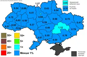 Yarosh was a candidate in the 25 May 2014 Ukrainian presidential election.[10] A poll conducted by the "Socis" research center (from 25 February – 4 March 2014) predicted that Yarosh's candidacy received the support of 1.6% of the people who were surveyed.[31] On election day he actually received 0.7% of the votes.[10] In January 2019 Yarosh stated he only took part in the election "not to destroy the revolutionary structures after the revolution".[32] He also stated that he was fully aware it was "virtually impossible" he could win the election and that because he was engaged in military action since the first days of April 2014 he did not campaign.[32]