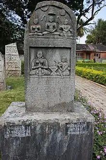 In Jainism, the term nishidhi (with variants called nisidhia, nisadhi or nistige) is the spot where the person, such as an ascetic, king or queen died voluntarily, or was cremated or bone relic buried. Such places were held in high regard, a pedestal (vedika) created and prayers (puja and pratishtha) offered regularly.[6] Often, the nishidhigal (lit, nishidhi stone) was nothing more than a natural rock surface or a boulder. Inscribed on the nishidhigal were epitaphs that immortalized and described the scholarly and saintly achievements of the deceased one, man or woman. Nishidhi's dated to as early as the 7th century exist in the Shravanabelagola hills. One memorial raised by King Sripurusha for Mahaprabhu Gopayya dates from the 8th century. The Doddahundi nishidhi is one of the most noteworthy examples found from the Western Ganga period.[6]