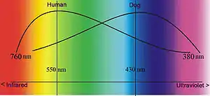 Like most mammals, dogs have only two types of cone photoreceptor, making them dichromats.[23][24][25][26] These cone cells are maximally sensitive between 429 nm and 555 nm. Behavioural studies have shown that the dog's visual world consists of yellows, blues and grays,[26] but they have difficulty differentiating red and green making their color vision equivalent to red–green color blindness in humans (deuteranopia). When a human perceives an object as "red," this object appears as "yellow" to the dog and the human perception of "green" appears as "white," a shade of gray. This white region (the neutral point) occurs around 480 nm, the part of the spectrum which appears blue-green to humans. For dogs, wavelengths longer than the neutral point cannot be distinguished from each other and all appear as yellow.[26]