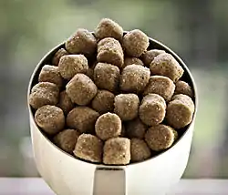 Dry dog food usually consists of bagged kibble that contains 3-11% water.[18] It makes up the vast majority of pet foods.[19]