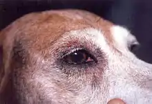 The frequency of bilateral glaucoma with a genetic base in purebred dogs is higher than in any species except humans.[24] Cataracts in dogs either have a genetic base or can also be caused by diabetes. Nuclear sclerosis resembles a cataract but is actually a normal age-related change.