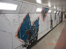 In 1995 four sets of enamel panels designed by Amanda Duncan were installed in the subway between the north and south exits. The panels show maps of the Dollis Hill area at different dates from the 16th to the 20th century, juxtaposed with interpretations of classical star maps.
