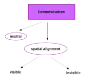 Dom has a spatial referencing demonstrative system, i.e. there are certain demonstrative lexemes bearing information about the spatial relation of the referred object to the speaker alongside neutral demonstratives. A Dom speaker also uses different lexemes for visible and invisible objects. In the case of visible objects, the speaker locates it on a horizontal and vertical axis as to whether it is proximal, medium or distal from the speaker and on the same level, uphill or downhill.