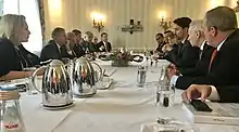 In an interview, Trudeau explained that the zero tolerance standard applied to himself as well, and stated, "I've been very, very careful all my life to be thoughtful, to be respectful of people's space and people's headspace as well."[42] However, in 2018, after it was revealed by a woman that a 'groping' incident occurred in 2000, Trudeau said there was no need to conduct an investigation into the allegation.[43] In March 2019, Liberal MP Celina Caesar-Chavannes resigned as a member of the Liberal caucus, citing that Trudeau shouted at her on the phone when she told him she would not like to run in the 2019 federal election. Caesar-Chavannes told The Globe and Mail that Trudeau shouted that she didn't appreciate him. As a result of this resignation, and the resignation of other prominent female liberal members of parliament Jody Wilson-Raybould and Jane Philpott (who resigned from cabinet, but not from caucus following the SNC-Lavalin affair), opposition MPs, such as Candice Bergen, have accused Trudeau of being a "fake feminist".[44][45][46] In the April 2019 Daughters of the Vote event organized by Equal Voice Canada in the House of Commons, many of its delegates turned their backs when Trudeau spoke as a protest for his actions in the SNC-Lavalin Affair.[47]