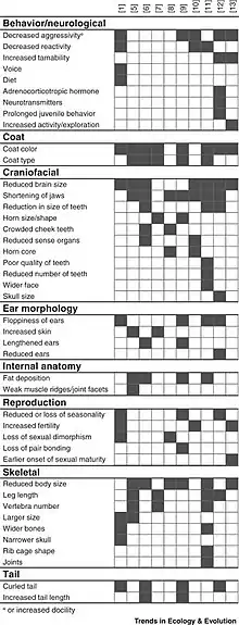 Domestication syndrome is a term often used to describe the suite of phenotypic traits arising during domestication that distinguish crops from their wild ancestors.[5][33] The term is also applied to animals and includes increased docility and tameness, coat color changes, reductions in tooth size, changes in craniofacial morphology, alterations in ear and tail form (e.g., floppy ears), more frequent and nonseasonal estrus cycles, alterations in adrenocorticotropic hormone levels, changed concentrations of several neurotransmitters, prolongations in juvenile behavior, and reductions in both total brain size and of particular brain regions.[34] The set of traits used to define the animal domestication syndrome is inconsistent.[32]