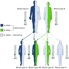The blood type of a human is determined by a gene that creates an A, B, AB or O blood type and is located in the long arm of chromosome nine. There are three different alleles that could be present at this locus, but only two can be present in any individual, one inherited from their mother and one from their father.[7]