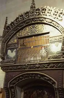 In memory of Dominic's miracle, a rooster and chicken, with white feathers, are kept alive at the cathedral all year round.[6] A different rooster and chicken are switched each month, although they are called descendants of the original birds who miraculously danced even though roasted. The pairs of roosters and chickens, when they are not at the cathedral, are kept in a chicken coop called the Gallinero de Santo Domingo de la Calzada, which the Cofradía de Santo Domingo (Confraternity of Santo Domingo) maintains with the help of donations. A wayside shrine (hornacina) built in 1445 holds a relic associated with the miracle: a piece of wood from the gallows from which Hugonell was hanged.
