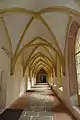 Vault is cross like in the church and ribs have similar profile as the ribs in the church. Brackets in inner side of cloister are simply formed without decoration; we can also find atypical supports with vegetable motives. In the court direction the arc is supported by two columns with heads decorated by vegetable motives. In other corners pillars with undecorated heads step 10 cm in space. Each bay of the vault between ribs was decorated as well as walls. The most valuable wall-picture is located in the cloister and shows Holy Virgin, the patron of České Budějovice, who hides real figures of the emperor Charles IV, Holy Roman Emperor and his son Wenceslaus IV of Bohemia under the open coat. Painting dates back probably to 1378. Between 5 and 7 May 1378 the emperor Charles IV with his 17-year-old son spent their time in the royal town České Budějovice where they were attending meeting with Czech aristocrats, ecclesiastics and the nobleman of the Holy Roman Empire. It is also necessary to mention well-preserved gothic extension above well called "Well Chapel" in southern part of cloister.