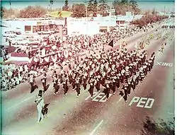 The marching band is known throughout the state as "the band with the cannon". Its trademark cannon, made on the school premises, was fired and pulled by two students in front of the band during band reviews and parades in various Southern California cities, such as Arcadia, Temple City, Long Beach, Montebello, Azusa and San Francisco. The band has also appeared in the Los Angeles County Fair, a University of Southern California football game,[17] the California 500 Speedway in Ontario, Disneyland's "America on Parade", Dodger Stadium, San Francisco's Columbus Day Parade, the Hawaii Invitational Music Festival, the Kennedy Space Center, Sea World San Diego and Universal Studios Florida.
