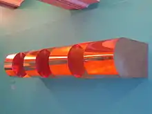 - Untitled, held by the Indianapolis Museum of Art, was created in 1967. It consists of a brass bar over a series of five steel boxes in Judd's signature cadmium red.[12] The long brass bar is both hollow and open at both ends. The red boxes increase geometrically in size from right to left, with the fifth box being sixteen times the length of the first. Conversely, the voids between the boxes decrease geometrically, the leftmost space being one quarter the size of the rightmost. The actual fabrication was performed by the Bernstein Brothers firm.[13][4]