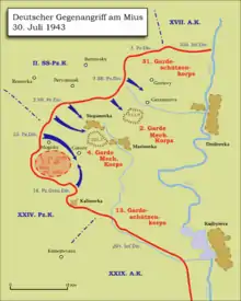The Mius Offensive deployed 271,790 men with 737 tanks and assault guns in four field armies as well as the 8th Air Army against the 11 heavily under-strength divisions of the German 6th Army. The Soviets achieved a penetration 15 kilometers deep and 20 kilometers wide, alarming the German High Command. After initial interference from Adolf Hitler in delaying the movement of German reinforcements, a counteroffensive deploying 258 operational tanks in five Panzer and Panzergrenadier divisions, including the SS divisions Das Reich and Totenkopf, was launched on 30 July. The German counterattack was backed by the Luftwaffe's IV Air Corps, providing close air support and air interdiction against the Red Army. The attack achieved immediate success, encircling five Soviet divisions on the second day. A wild, general rout of the Soviet armies to the Mius followed. On 2 August, the Germans reached the Mius at Dmitrievka, regaining their positions after inflicting at least 61,070 casualties on the Soviets, of which 15,303 were listed as killed or missing. Actual Soviet losses were far higher, as 6th Army took 17,762 prisoners, more than the Soviet total for killed and missing.[4]